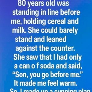 An elderly woman—well into her eighties—stood in line ahead of me, holding a small box of cereal and a carton of milk. She looked fragile,…