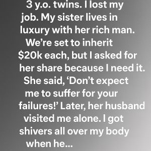I’m a widow with three-year-old twins, struggling to make ends meet after losing my job. My sister, on the other hand, lives a life of luxury thanks…
