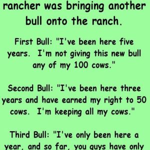 Three bulls heard the rancher was bringing another bull onto the ranch… First Bull: “I’ve been here five years. I’m not giving this new bull any of…