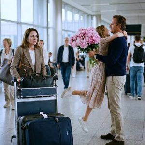 I came back one day early and saw my husband at the airport with flowers! she jumped in his arms