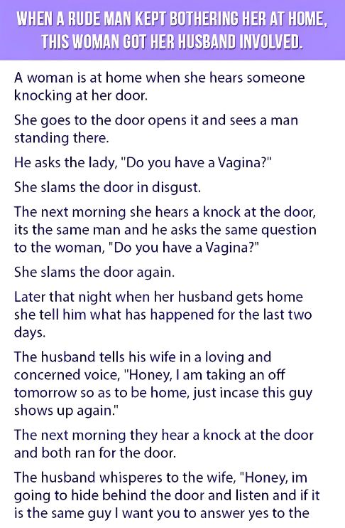 She slams the door in disgust. The next morning she hears a knock at the door, its the same man and he asks the same question to the woman, “Do you have a Vagina?” She slams the door again. Later that night when her husband gets home she tell him what has happened for the last two days.