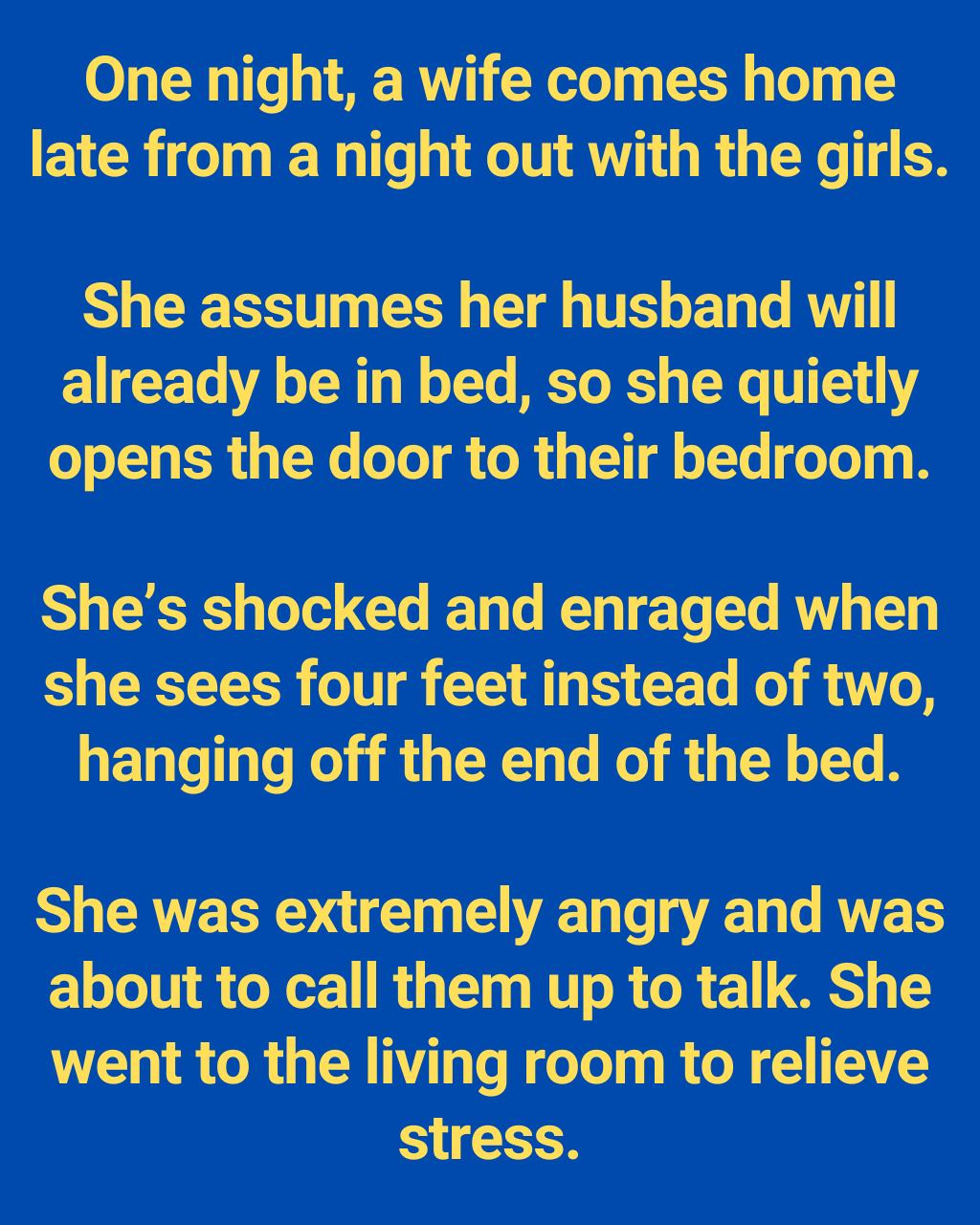 She’s shocked and enraged when she sees four feet instead of two, hanging off the end of the bed.