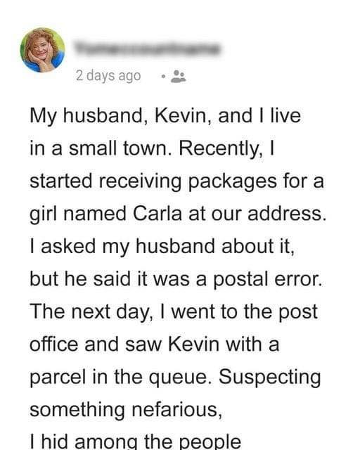 My husband, Kevin, and I live in a small town. Recently, we started receiving packages for a girl named Carla at our address. I asked my husband about it, but he said it was a postal error. The next day, I went to the post office and saw Kevin with a parcel in the queue. Suspecting something nefarious, I hid among the people.