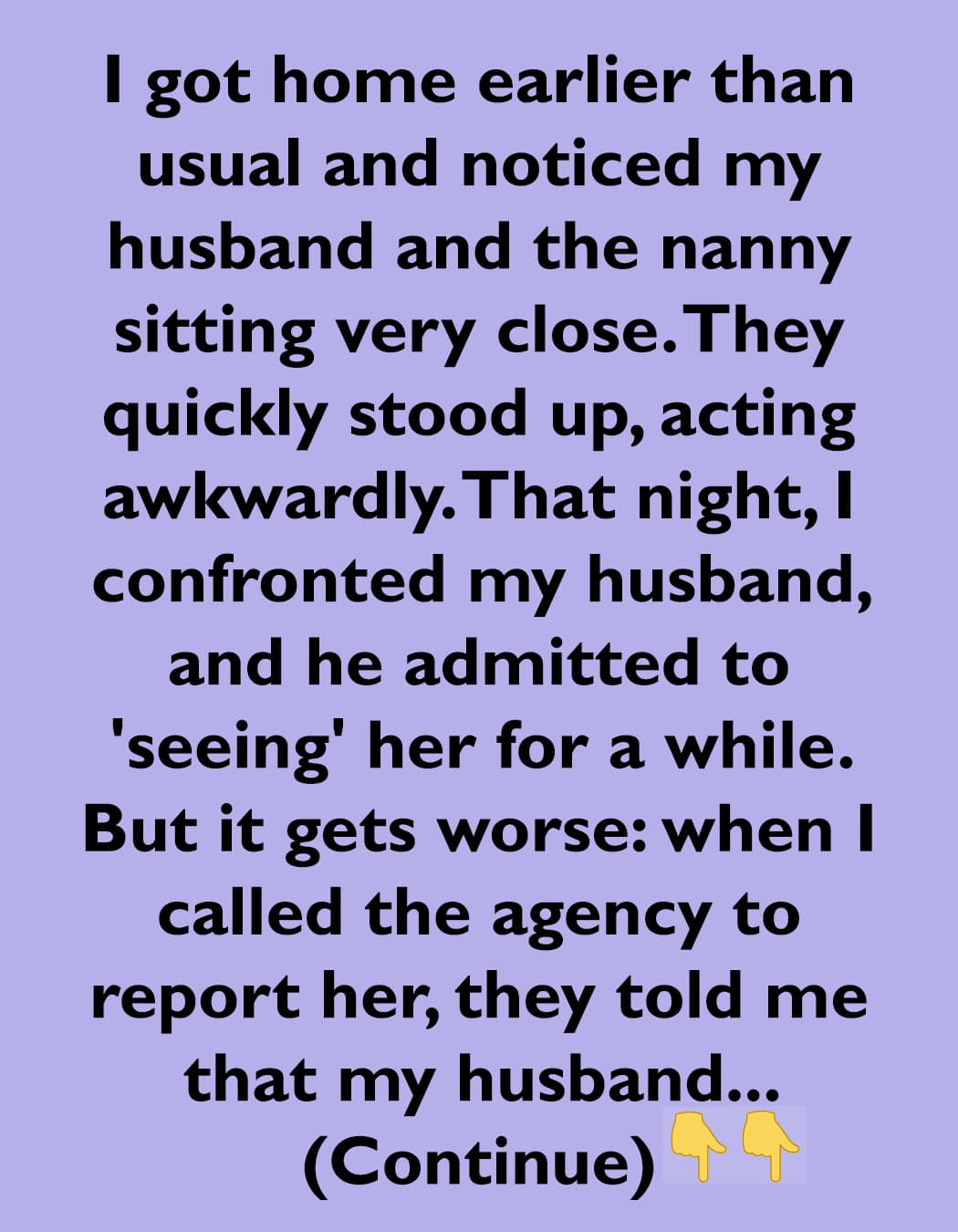 Then last week, I got home earlier than usual and noticed my husband and the nanny sitting very close. They quickly stood up, acting awkwardly. That night, I confronted my husband, and he admitted to “seeing” her for a while. But it gets worse: when I called the agency to report her, they told me that my husband had already called earlier that day.