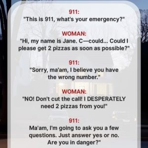 911: “This is 911, what’s your emergency?” WOMAN: “Hi, my name is Jane. C-could… Could I please get 2 pizzas as soon as possible?” 911: “Sorry, ma’am,…