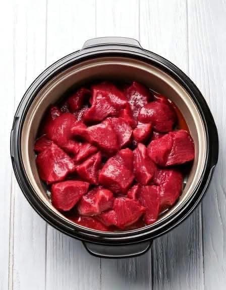 1. Place the beef cubes in the bottom of your slow cooker.