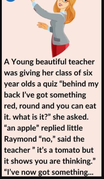 A Young beautiful teacher was giving her class of six year olds a quiz “behind my back I’ve got something red, round and you can eat it.