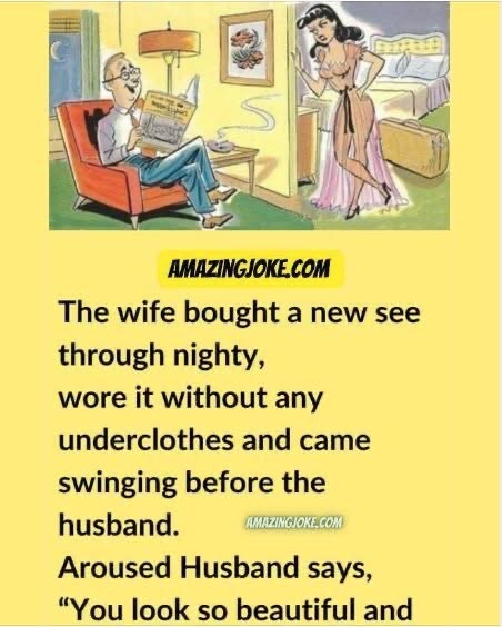 his wife bought a new see-through nightgown one day. She was feeling daring, so she chose to surprise her husband by wearing it without any underwear.