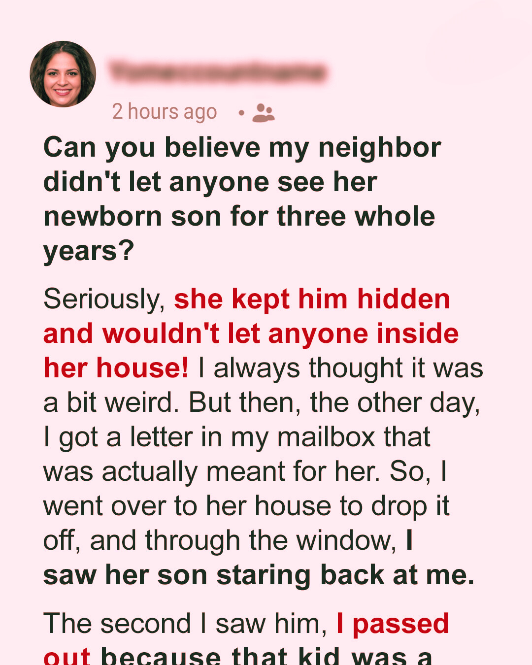 Something always felt off about my neighbor Nelly. In three years, I’d barely seen her outside, except to check the mail or drive to the store. What felt even stranger was that she’d been heavily pregnant when she moved in. Yet, no one had seen her baby even once in these three years.