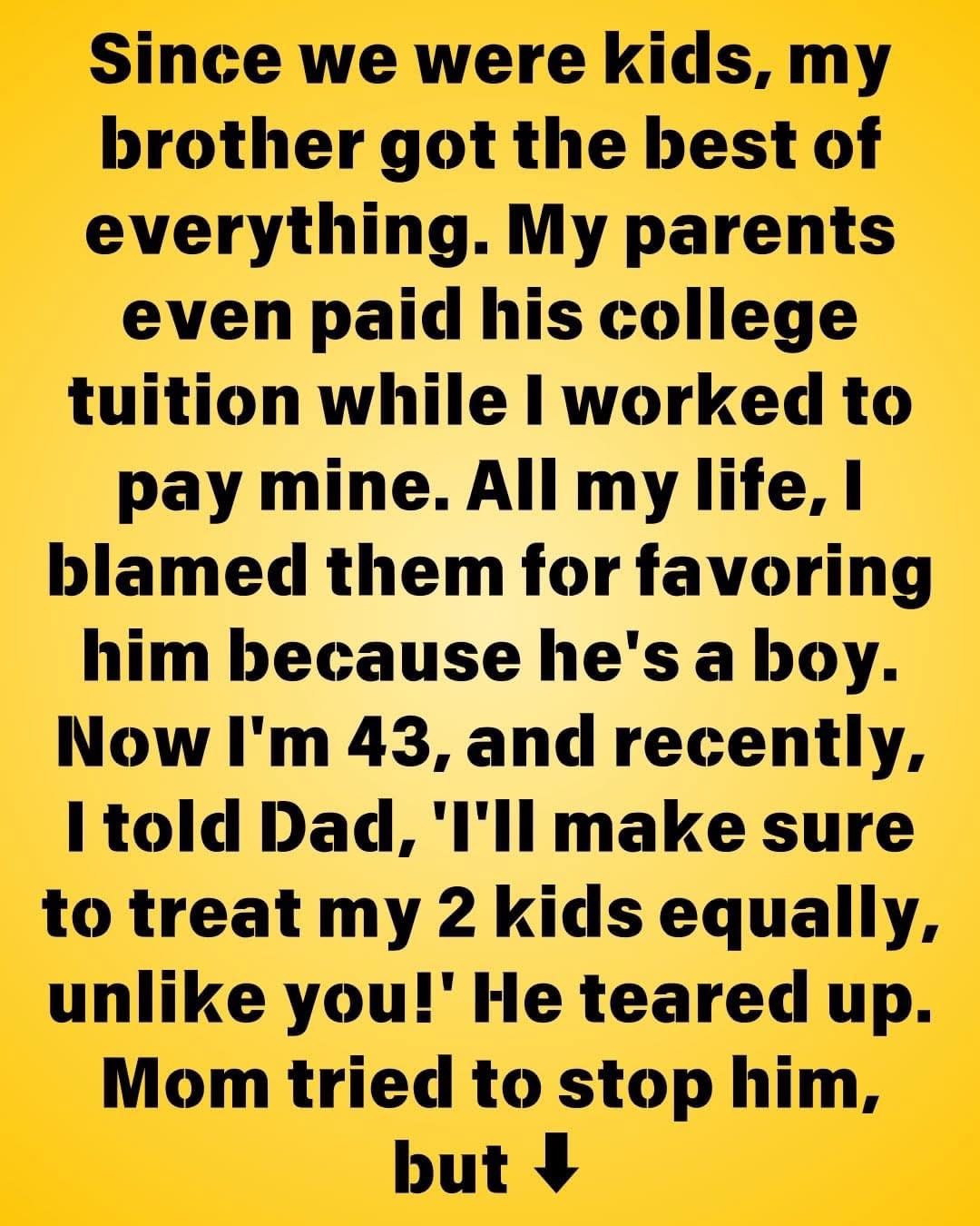 Now I’m 43, and recently, I told Dad, “I’ll make sure to tre:at my 2 kids equally, unlike you!”