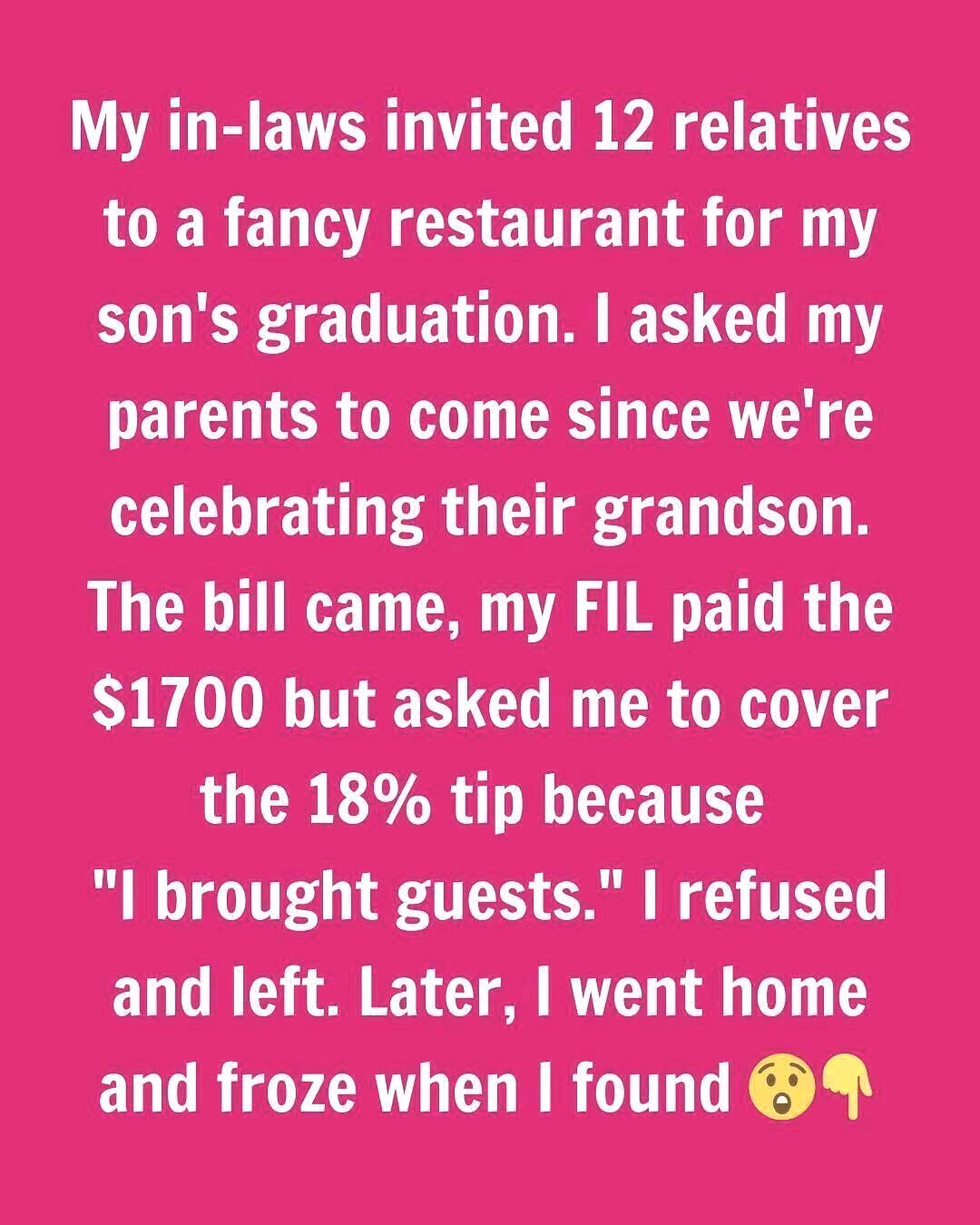 When the bill came, my father-in-law paid the $1700 and asked me to pay the 18% tip because “I brought guests.” I refused and left. My wife was quiet.