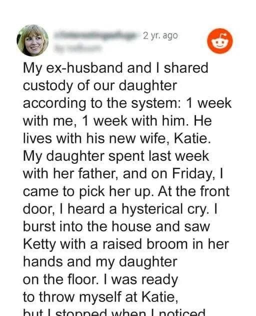 My initial reaction was to lash out at Katie, accusing her of harming my child — the scene had been right there before me. My daughter was on the floor, looking like she had been flung there, and her stepmother standing above her, holding a broom.