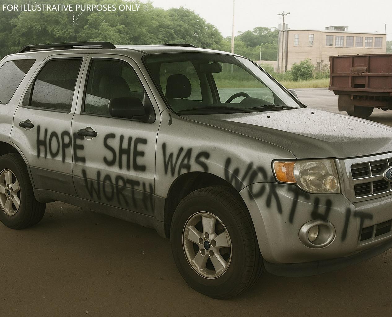 Scrawled across the driver’s side door in bold, unapologetic letters were the words: “Hope She Was Worth It.”