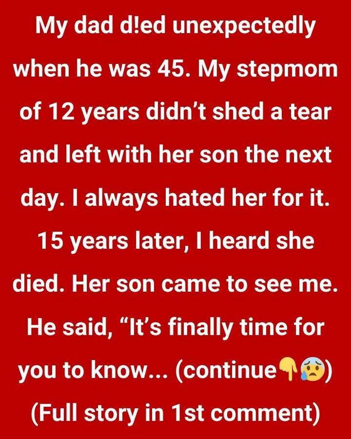 15 years later, I heard she had died. Her son came and demanded to see me. He said, “It’s finally time for you to know what really happened.” He explained that my father had been sick for a while but didn’t want me to know—I was too young, and he wanted to spare me the pain.