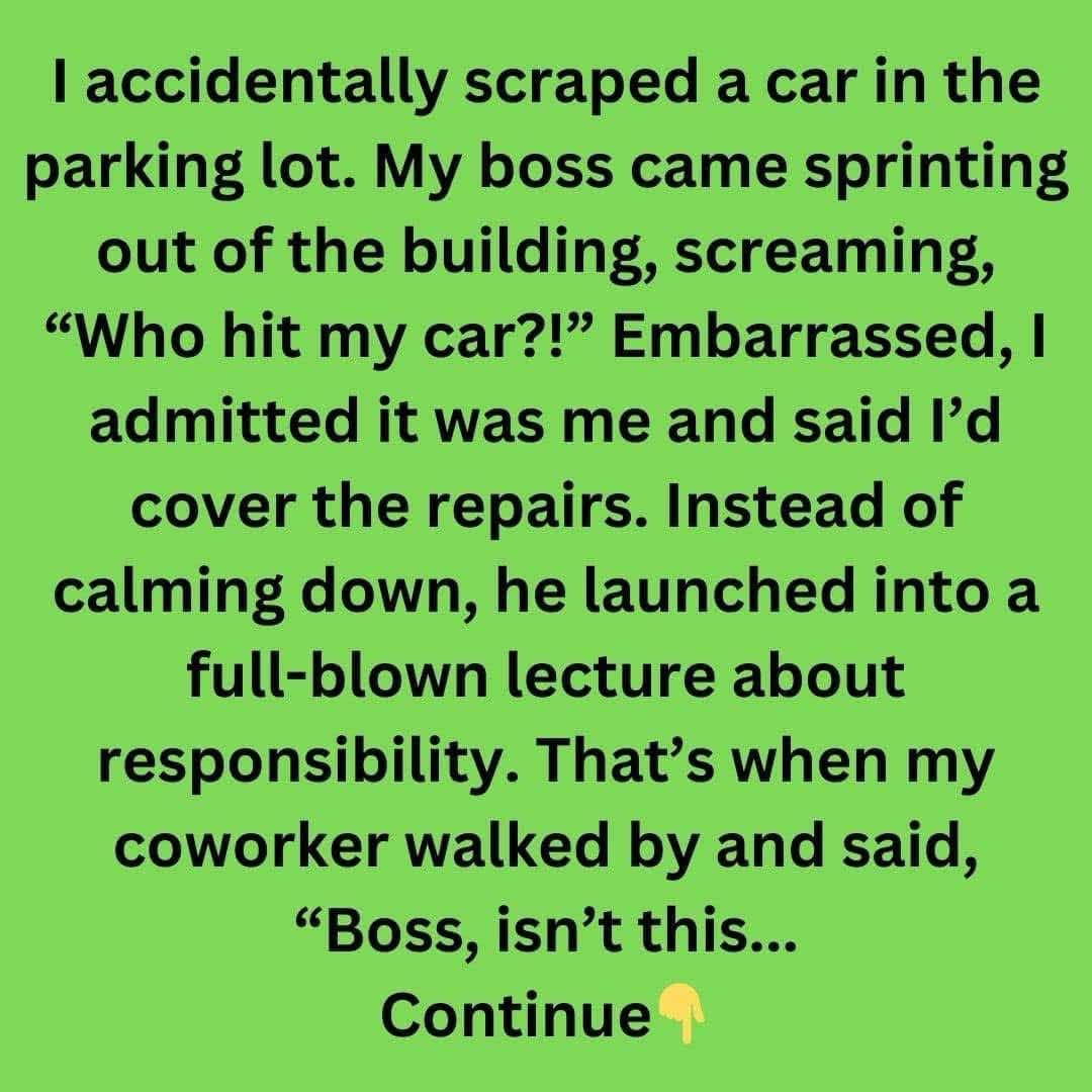 I accidentally scraped a car in the parking lot. My boss came sprinting out of the building, screaming, “Who hit my car?!” Embarrassed, I admitted it was me and said I’d cover the repairs. Instead of calming down, he launched into a full-blown lecture about responsibility.That’s when my coworker walked by and said, “Boss, isn’t this the company car you scratched last week?” My boss turned beet red, muttered something under his nose and stormed back inside.