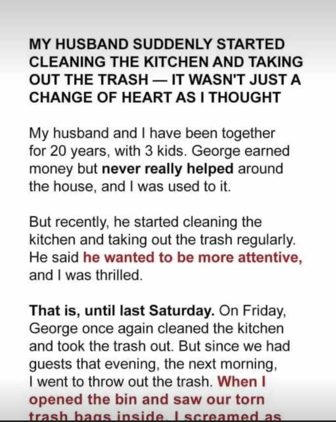 Her heart sank. The evidence was clear—George wasn’t cleaning the house out of love or thoughtfulness. He was covering his tracks.