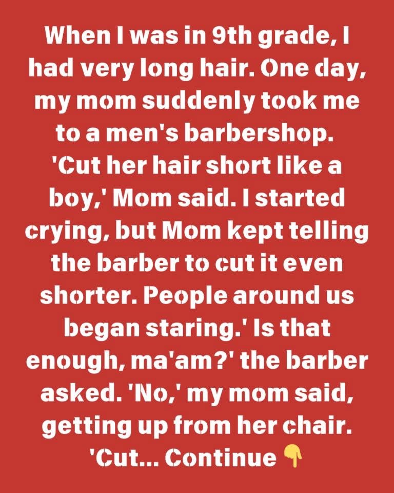 When I was in ninth school, I had quite long hair. One day, my mother unexpectedly took me to the barbershop.