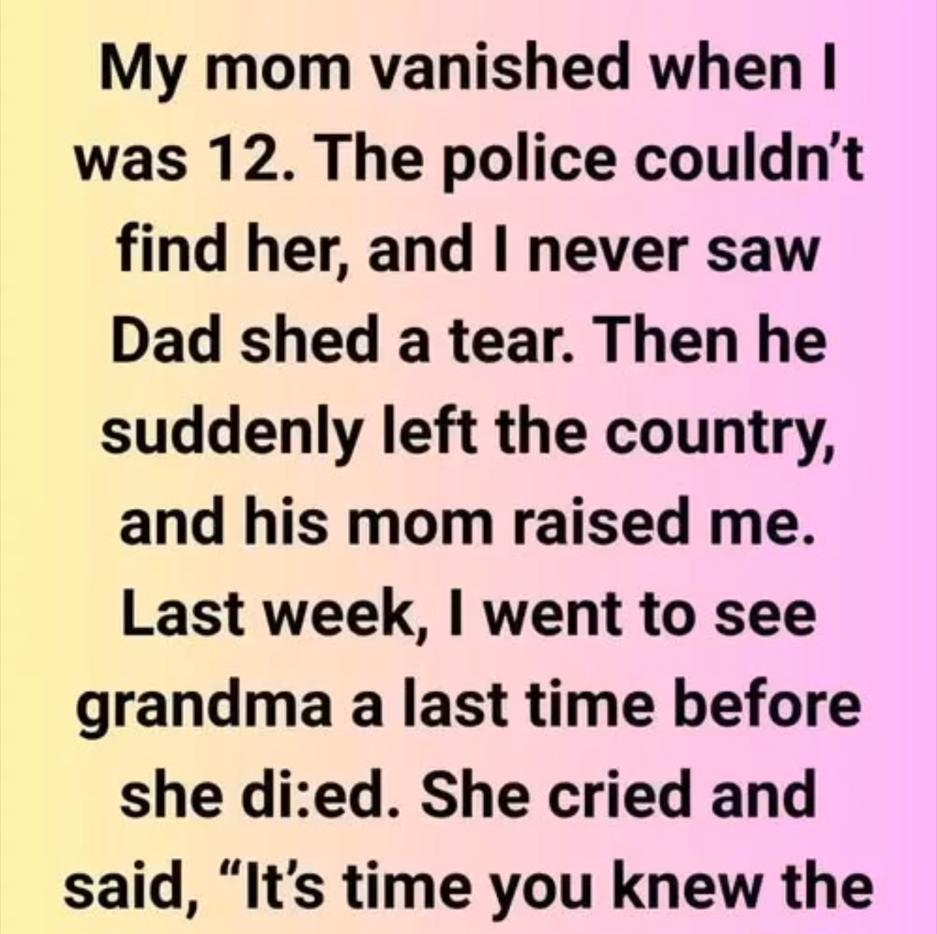 My mom disappeared when I was 12. The police searched for her but never found a trace, and I never saw my dad shed a single tear. Then, without warning, he left the country, and I was raised by his mother. Last week, I visited Grandma one last time before she passed away. Through her tears, she said, “Forgive me… It’s time you learned the truth. Your mom didn’t disappear—she made a choice to leave. She told your dad never to contact her again.”