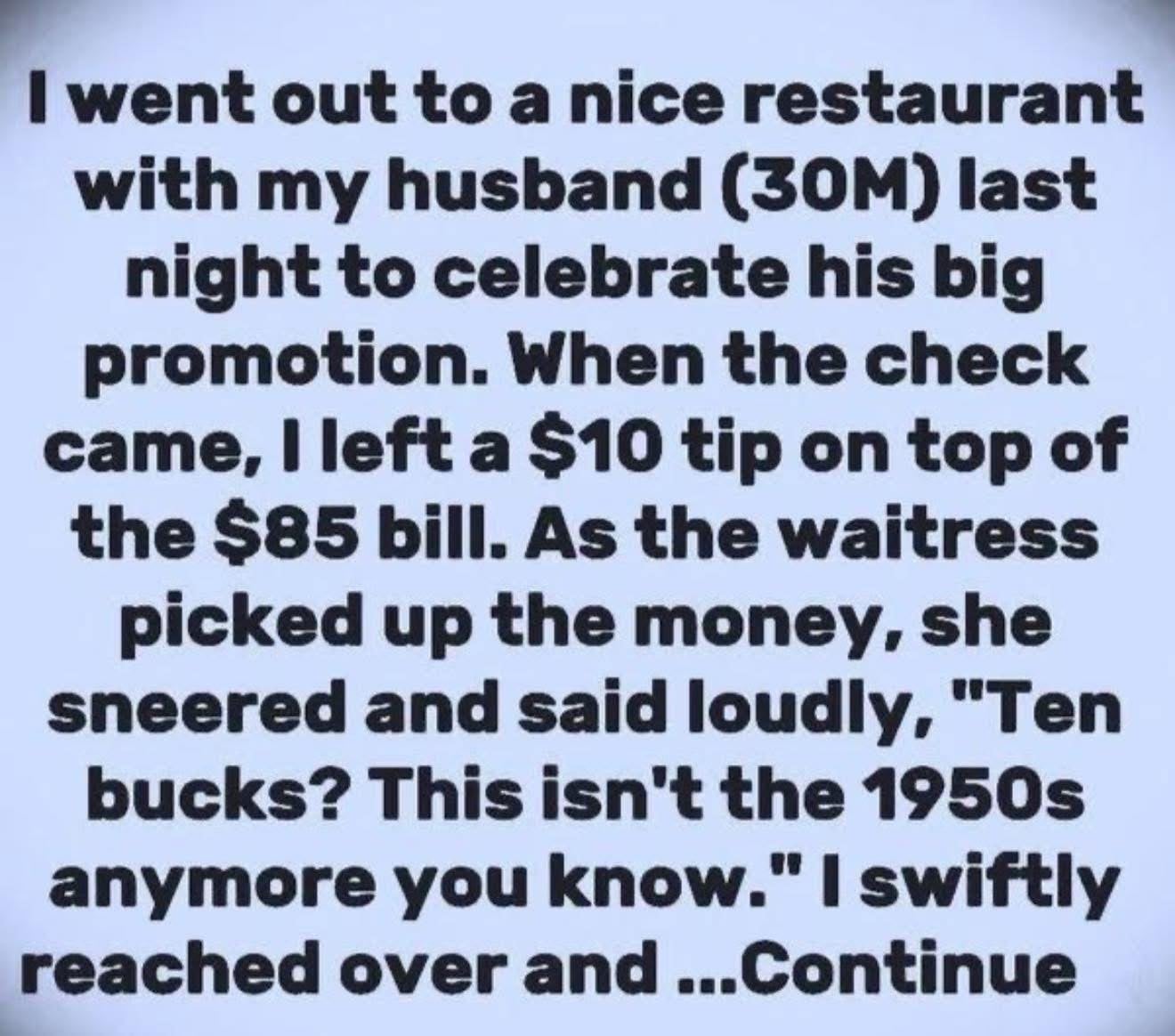What was supposed to be a celebratory dinner for her husband’s promotion turned sour due to an encounter with a rude waitress.After enjoying their meal, Amelia left a $10 tip on an $85 bill. However, the waitress responded with a sneer, saying, “Ten bucks? This isn’t the 1950s anymore.”