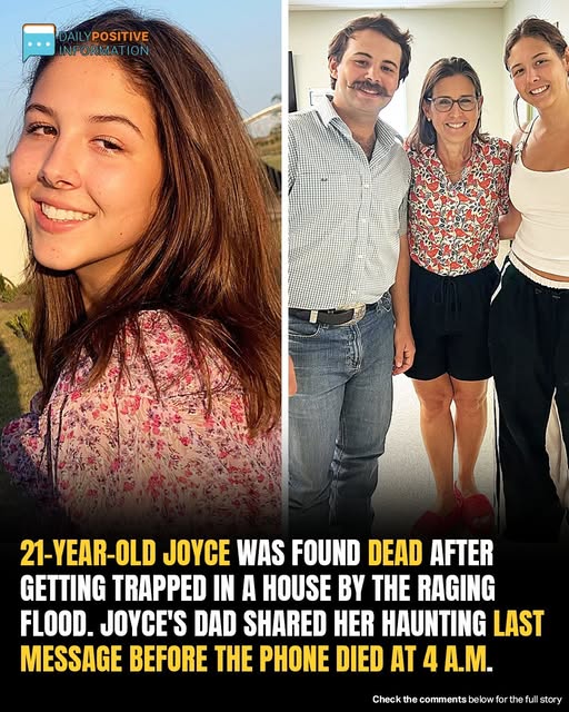 The group was staying near the Guadalupe River when sudden floodwaters hit around 4 a.m., destroying their vehicles and trapping them before they could escape. Joyce was last heard saying, “They just got washed away,” before her phone went dead. Aidan had also told his father, “I’ve gotta go. I gotta help Ella and Reese,” moments before the line cut off.Reese’s body has since been found. Joyce and Reese are confirmed dead, while Aidan and Ella remain missing. Joyce is remembered as…