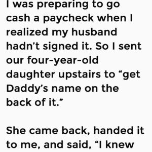 I was preparing to go cash a paycheck when I realized my husband hadn’t signed it. So I sent our four-year-old daughter upstairs to “get Daddy’s name…