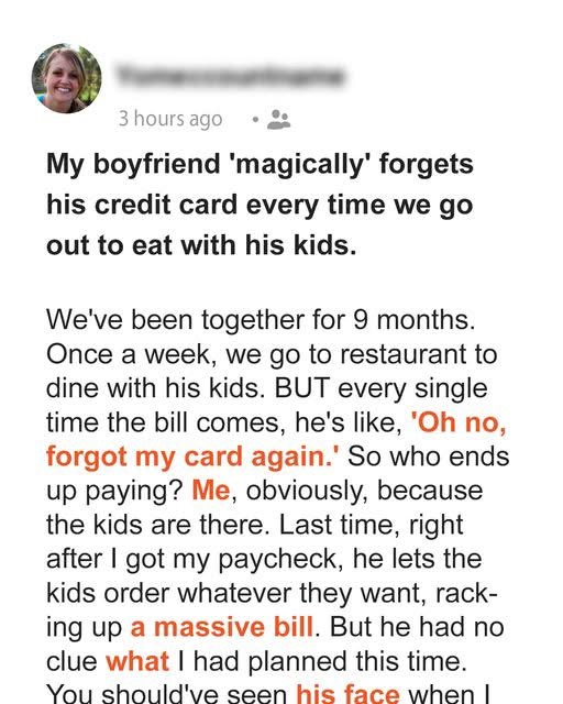 Knowing that he often “forgot” his wallet, she sent him a text reminding him to bring it. Her boyfriend Iaughed the text off. When they arrived at the restaurant, her boyfriend’s children ordered many new things off the menu, which the woman said were relatively pricey.