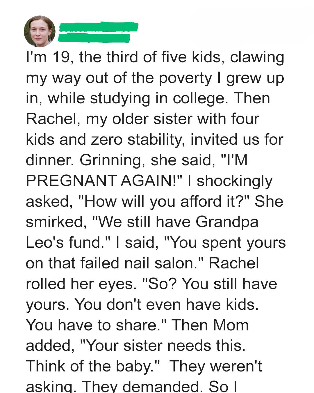 My older sister Rachel had already burned through her own share of the fund on a failed business and luxuries she couldn’t afford. At 27, pregnant with her fifth child, she made a shocking announcement during a family dinner: she wanted my portion of the college fund “for the baby.” The worst part? My mother and other siblings backed her. They saw my education as expendable compared to another of Rachel’s “emergencies.” But for the first time, I said no.