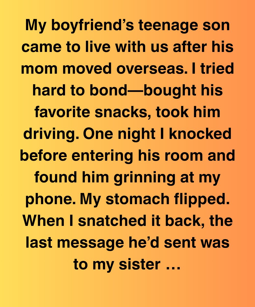 My boyfriend’s teenage son came to live with us after his mom moved overseas. I tried hard to bond—bought his favorite snacks, took him driving. One night I knocked before entering his room and found him grinning at my phone. My stomach flipped. When I snatched it back, the last message he’d sent was to my sister…