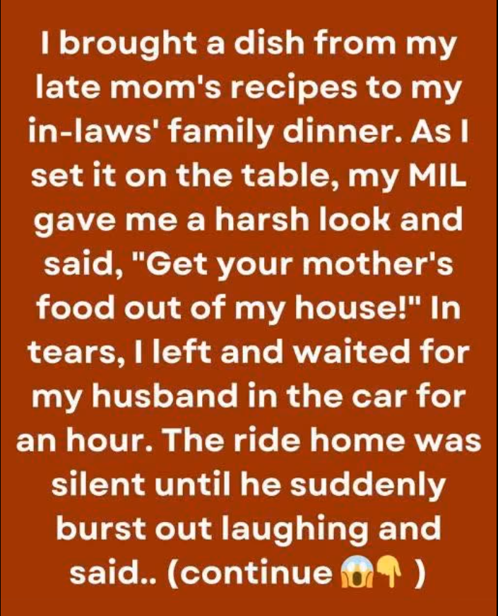 My chest tightened. My hands trembled. I was too stunned to speak, and the tears came before I could stop them. I quietly picked up the dish and left, sitting alone in the car for over an hour, staring out the window and wondering what I had done wrong. Finally, my husband came out and sat beside me. The silence was unbearable. I expected him to comfort me or at least say something. Then, out of nowhere, he burst out laughing.
