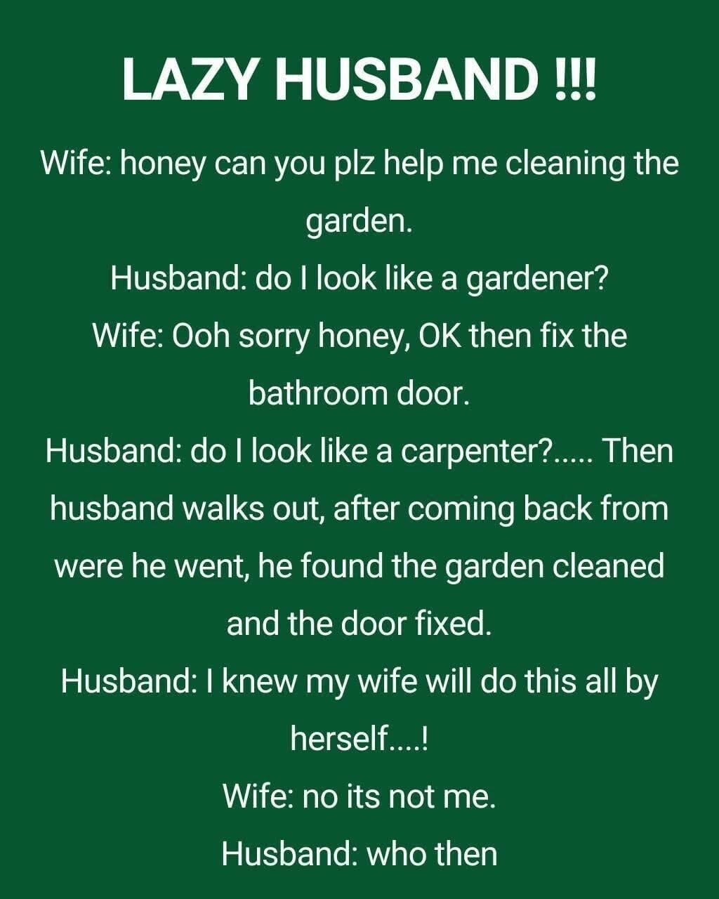 Then husband walks out, after coming back from were he went, he found the garden cleaned and the door fixed.