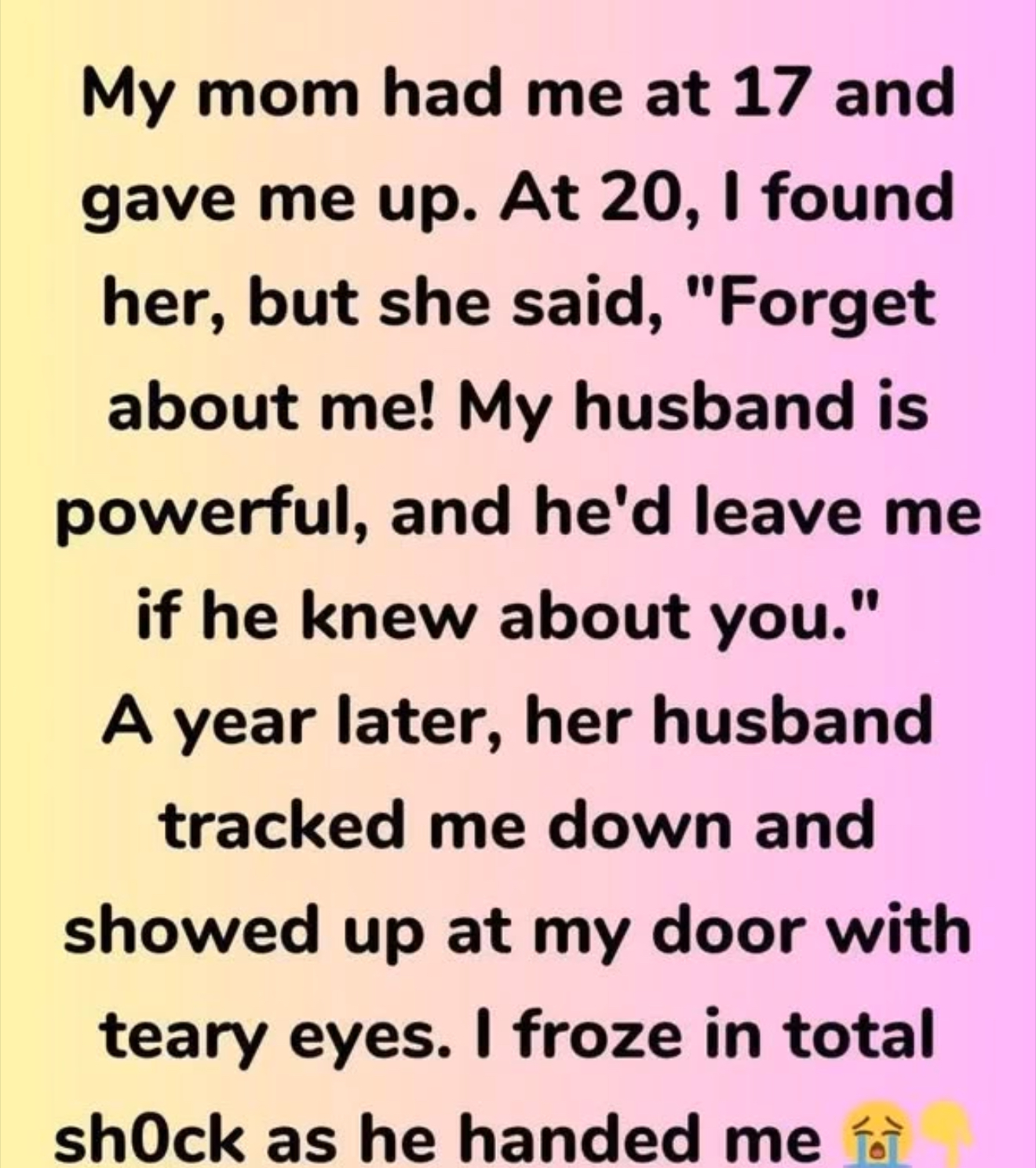 My mom had me at 17 and gave me up. At 20, I finally found her, heart racing with hope. But when I stood in front of her, she looked terrified. “Forget about me!” she whispered sharply. “My husband is powerful, and he’d leave me if he knew about you.” Her words felt like a…