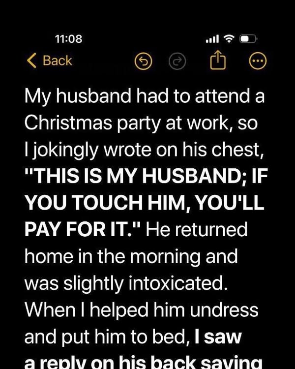 Micaela thought it was just a playful joke when she wrote a warning on her husband Travis’s chest before his office Christmas party: “This is my husband — touch him, and you’ll pay. – M.” But later that night, as she undressed her intoxicated husband, she noticed a smudged reply written beneath it: “Keep the change.” At first, she laughed it off, but the words haunted her all night.