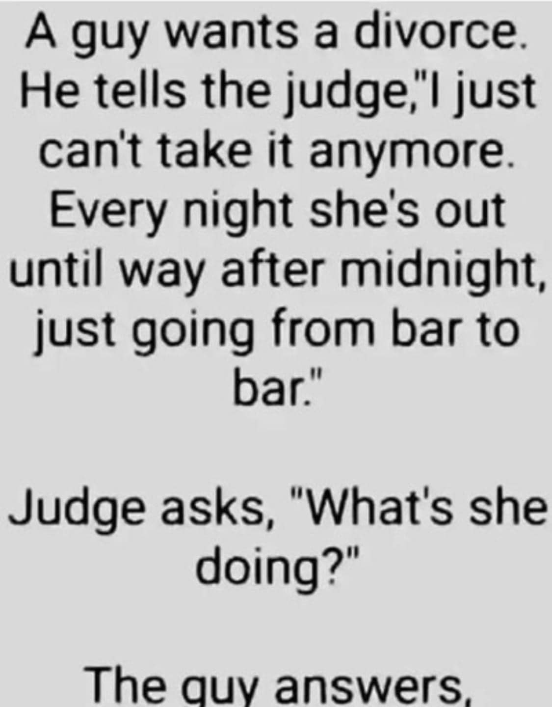 A guy wants a divorce. He tells the judge, “I just can’t take it anymore.