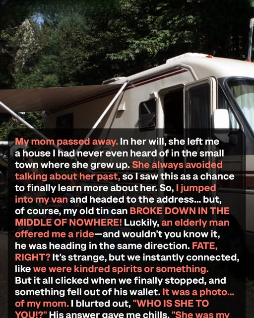After my mother died, I thought I knew everything about her life. She had raised me alone; my father had vanished before I was born. To escape the grief, I bought an old RV and set off to scatter her ashes in the town she loved. But the RV broke down in the middle of nowhere. An elderly man, Oliver, and his daughter, Grace, stopped to help. They were warm and kind, and I felt a strange comfort with them.