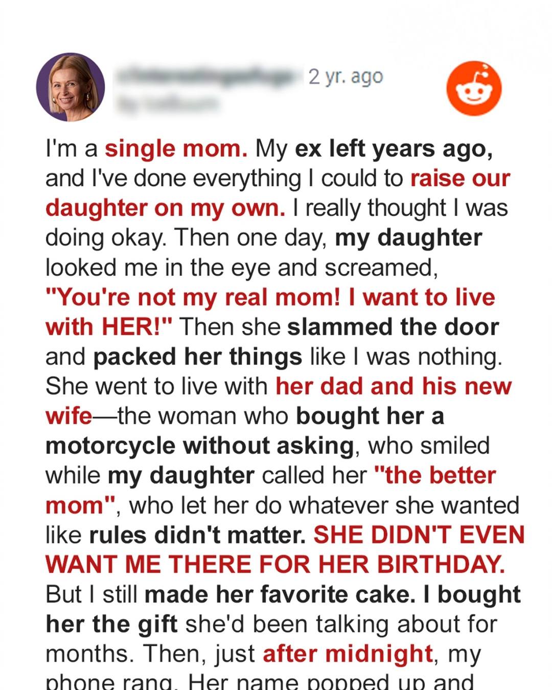 wants to hear the ex-wife complain. Things changed when Mary-Ann became a teen. She grew distant, rebellious. She stopped listening to me, and every rule I set made her hate me more. Ben, meanwhile, played the “cool dad,” while Jessica tried to be the “fun mom.” Then came the final blow: for her 15th birthday, they gifted her a motorcycle. Without telling me. I was furious. “She’s still a child,” I told them. But Mary-Ann just screamed,