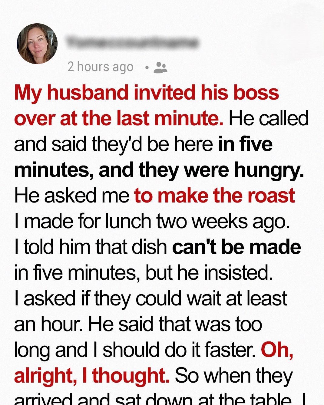 When Nathan called, chirping that he’d be home in five—with his boss, Celeste—I stared at the phone in disbelief. I had a pitch deck due, two sleeping kids, and zero time to whip up his requested roast. But of course, he assumed I’d manage. I always did. I always had.