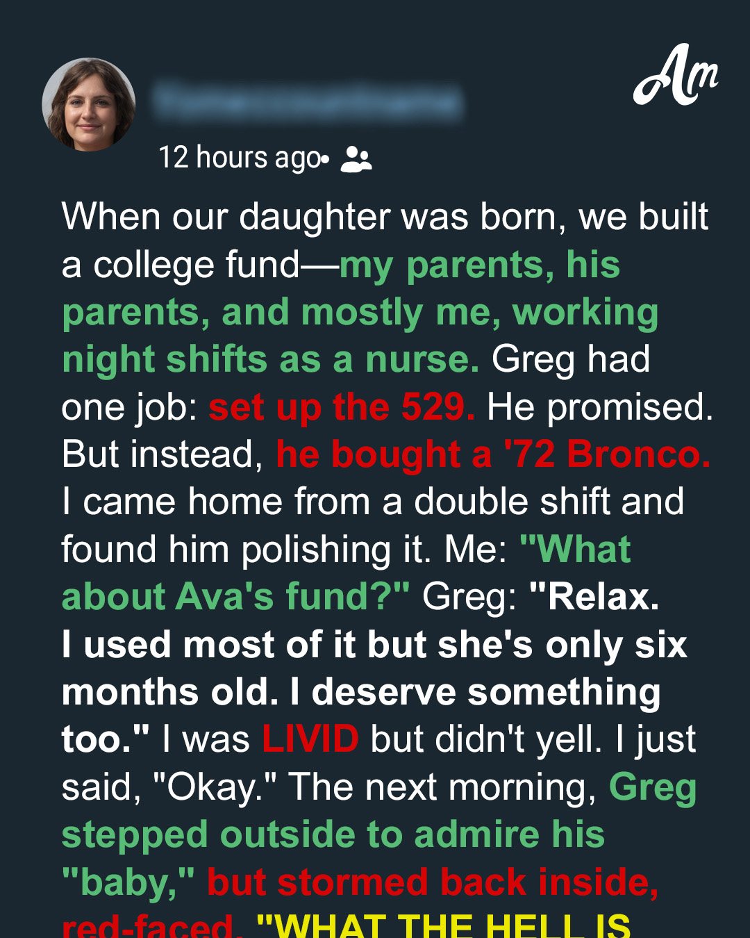 My husband Greg promised to secure our daughter Ava’s future. Instead, he spent her $45,000 college fund on a rusty 1972 Ford Bronco. That money came from both our families and months of overtime shifts I worked as a nurse. Greg had one job—deposit it in a college fund. But the moment he saw that truck, reason flew out the window.