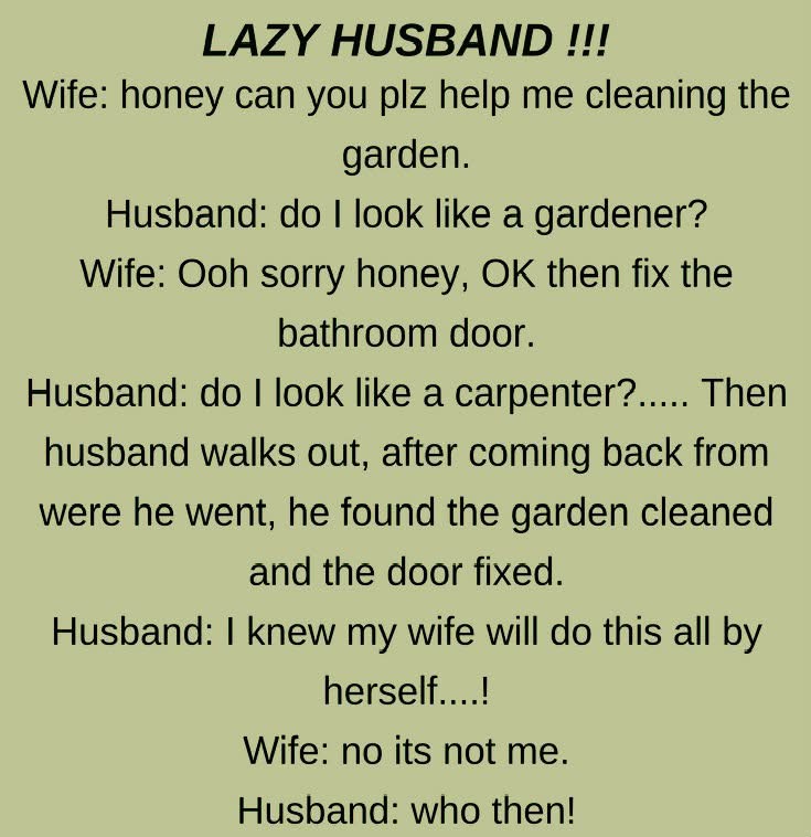 Then husband walks out, after coming back from were he went, he found the garden cleaned and the door fixed.
