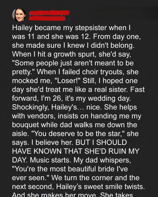 Hailey had been my stepsister since we were kids, but she never let me forget I was the outsider. For years she mocked my looks, belittled my achievements, and kept her distance. So when she offered to “help” with my wedding, I thought maybe she’d finally changed. She took charge of the flowers, the music, even promised to hand me my bouquet during the ceremony. I almost believed we’d turned a corner.