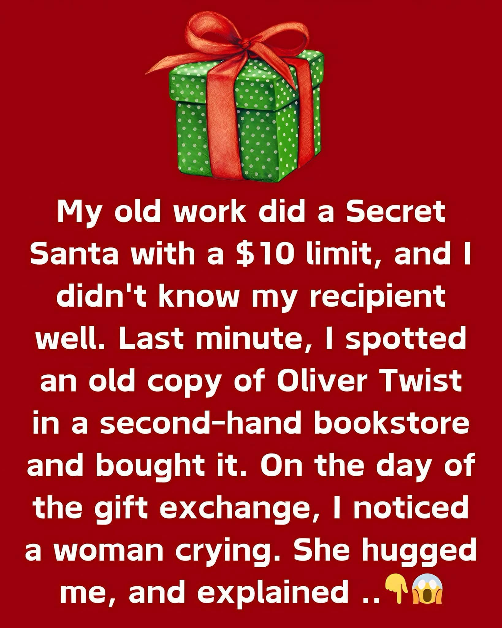 “My old work did a Secret Santa with a $10 limit, and I didn’t know my recipient well. Last minute, I spotted an old copy of Oliver Twist in a second-hand bookstore for $10 and bought it.
