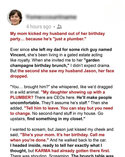 My mom used to be the woman who stood by my dad through every hardship double shifts, lean years, even driving his work truck when his back gave out. But after she left him for Vincent, a wealthy “consultant,” she traded our modest home for a gated mansion and started caring more about status than substance. When she invited me to her lavish “Garden Champagne Birthday Brunch,” I brought my husband Jason a plumber with calloused hands, a big heart, and the same quiet integrity my dad has.