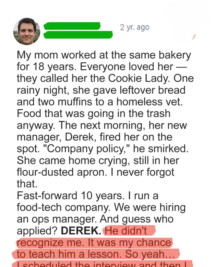 firing “an older woman” for giving away baked goods. I told him, “That older woman was my mother.” His smirk disappeared