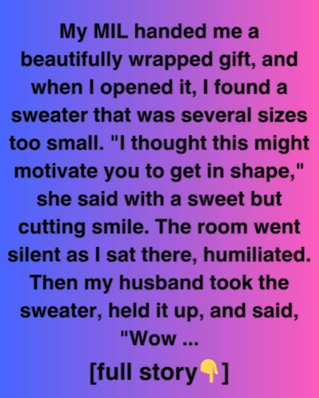 My MIL handed me a beautifully wrapped gift, and when I opened it, I found a sweater that was several sizes too small. “I thought this might motivate you to get in shape,” she said with a sweet but cutting smile. The room went silent as I sat there, humiliated. Then my husband took the sweater, held it up, and said, “Wow.”