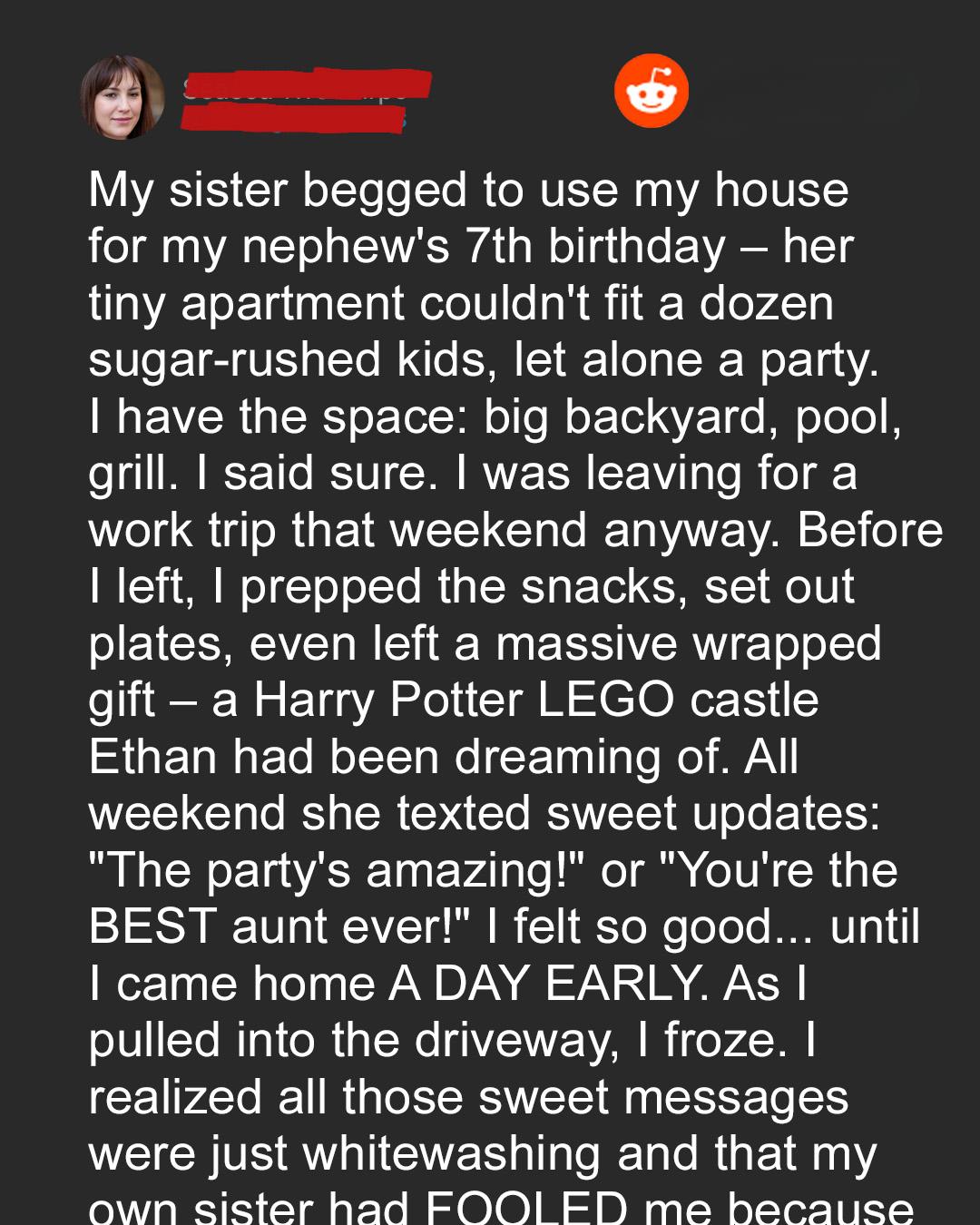 When my sister Sue asked to use my house for her son’s birthday party, I agreed without hesitation. My place was larger, and I’d be out of town for a work conference. I even left out party supplies, snacks, and a special $400 LEGO gift for my nephew, Ethan. Her sweet texts during the event made me feel like the best aunt in the world. But everything changed when I got home early and noticed decorations that didn’t match a seven-year-old’s party theme.