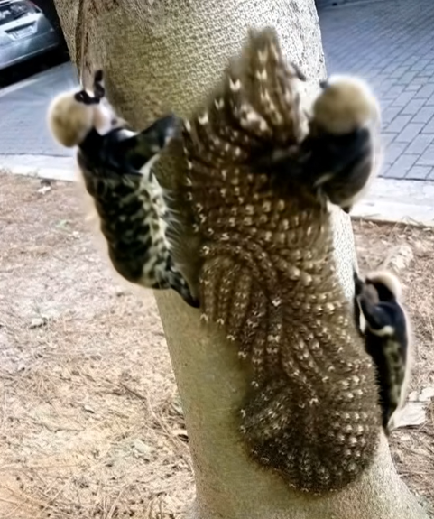 As she reached toward the trunk, something didn’t feel right. My husband quickly ran over and gently pulled her hand back. That’s when we noticed that the “stripes” weren’t part of the tree at all—they were a cluster of caterpillars, camouflaged against the bark.