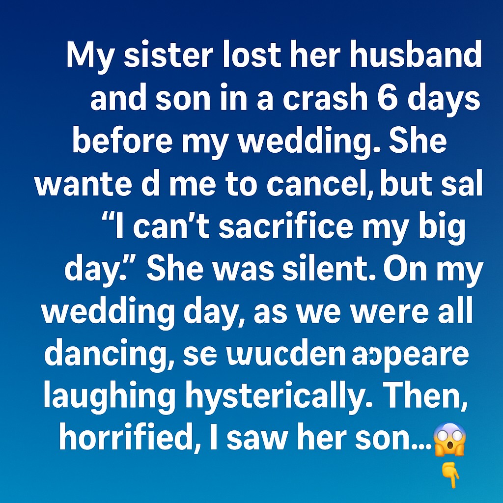 My sister lost her husband and son in a tragic crash just six days before my wedding. Heartbroken and shattered, she asked me to cancel. But I was stubborn, saying, “I can’t sacrifice my big day.” She didn’t argue further—she simply went quiet, her silence heavier than any words. When the wedding day arrived, everything seemed perfect. The music played, guests laughed, and the dance floor glowed with happiness. I should have been overjoyed, yet a part of me felt a strange emptiness knowing my sister was grieving alone.
