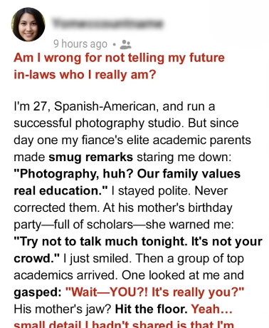 Now, I’m asking myself whether withholding my past was a mistake or a quiet test. I didn’t want to be loved for my résumé—I wanted to be seen for who I am. And maybe now I see the real issue: marrying someone whose family only values people when they meet their expectations.