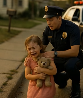 Her pink dress clung to her small frame, her cheeks streaked with tears. One hand clutched a worn teddy bear; the other kept swiping at her face, as if she could wipe the fear away.
