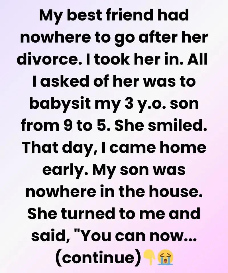 My dearest friend had nowhere to go following her divorce, so I took her in. My hubby said nothing. All I requested was that she watch our three-year-old boy from 9 to 5. She grinned and replied, “Sure, I’ll be your nanny!”