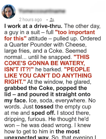 Working the drive-thru isn’t easy, but I do it to support my son. That Tuesday started rough—my child missed the bus, I was late, and I was barely holding it together. Then a man in a luxury car pulled up and, after complaining about his order, threw an entire cup of soda in my face. He drove off like nothing happened, leaving me soaked, shocked, and humiliated in front of my coworkers.